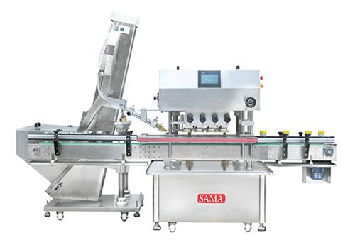Эта машина навинчивает крышки на круглые, квадратные или приплюснутые бутылки. Скорость 40-60 бутылок/мин, диаметр крышки 19-55 мм, диаметр бутылки 23-100 мм. Мощность 2000 Вт, AC 220 В, 50/60 Гц, вес прибл. 650 кг, требуется воздух 0,4-0,6 МПа. Габариты основного блока 2000x1030x1800 мм, подъемника 1060x560x2200 мм. Подходит для фармацевтических и общих упаковочных задач.