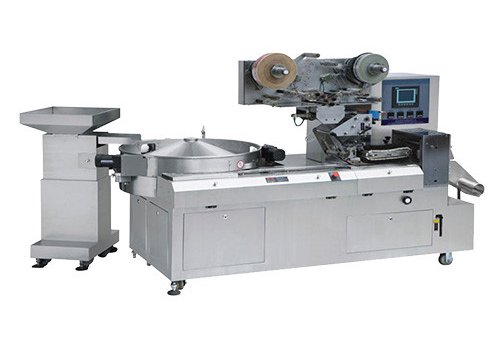 Эта машина предназначена для упаковки нескольких мелких предметов, таких как конфеты, в одну упаковку. Она использует метод верхней пленки и вибрационный питатель для сохранения формы продукции. Машина достигает скорости работы до 1200 пакетов в минуту и обрабатывает очень малые размеры пакетов, с длиной 12-40мм, шириной 12-30мм и длиной готового пакета 50-80мм. Она оснащена шестиголовочным ротационным резаком для одновременной резки и упаковки.