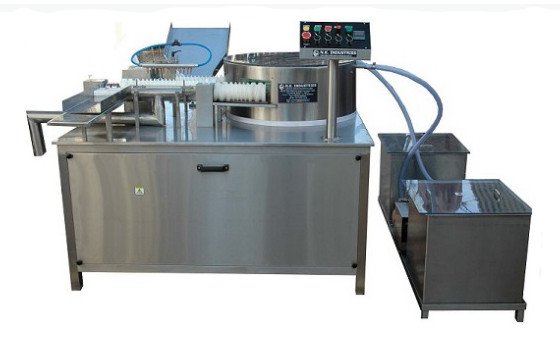Предназначена для мойки внешней поверхности ампул в 4 цикла — мойка водой с пеномоющим средством, мойка водой, обдув воздухом и нагрев. Машина работает со скоростью до 250 ампул в минуту, скорость регулируется с панели управления.
