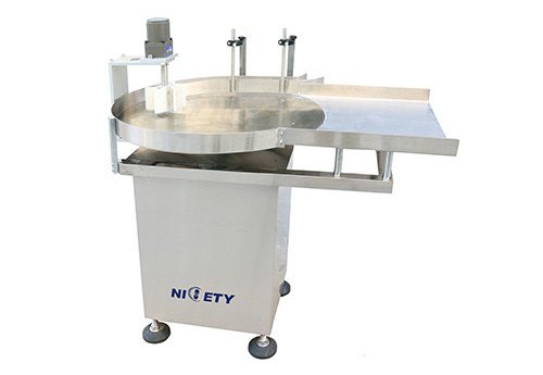 Поворотный стол — это система подачи, где операторы вручную размещают бутылки в вертикальном положении на вращающейся платформе, которая затем автоматически и упорядоченно подает их на конвейер. Он работает с бутылками из различных материалов (пластик, стекло, керамика, металл) и форм, что делает его идеальным для крупных контейнеров и маломощных производственных линий. Машина работает со скоростью 80 бутылок в минуту, проста в использовании и не требует специального обучения оператора.