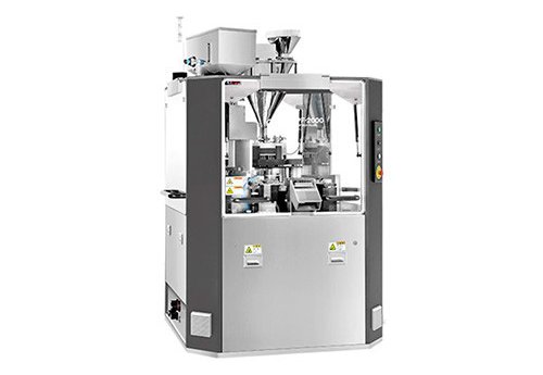 The machine is capable of handling powders, granules, pellets, and tablets. Its modular design allows for various filling combinations. The machine achieves output rates from 75,000 to 105,000 capsules per hour for powder and 45,000 to 63,000 for pellets, depending on the segment configuration. It ensures accurate dosing and complies with CE, cGMP, and 21 CFR Part 11 standards.