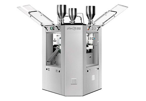 This rotary tablet press is specifically designed for the production of triple-layer tablets in the pharmaceutical industry. It also achieves single-layer production speeds of up to 163,200 tablets per hour with a compression force of 100 kN. Key features include a 30-minute turret change for multiple formats, automatic weight regulation, and compliance with cGMP and CFR Part 11 standards, making it essential for complex tablet manufacturing.